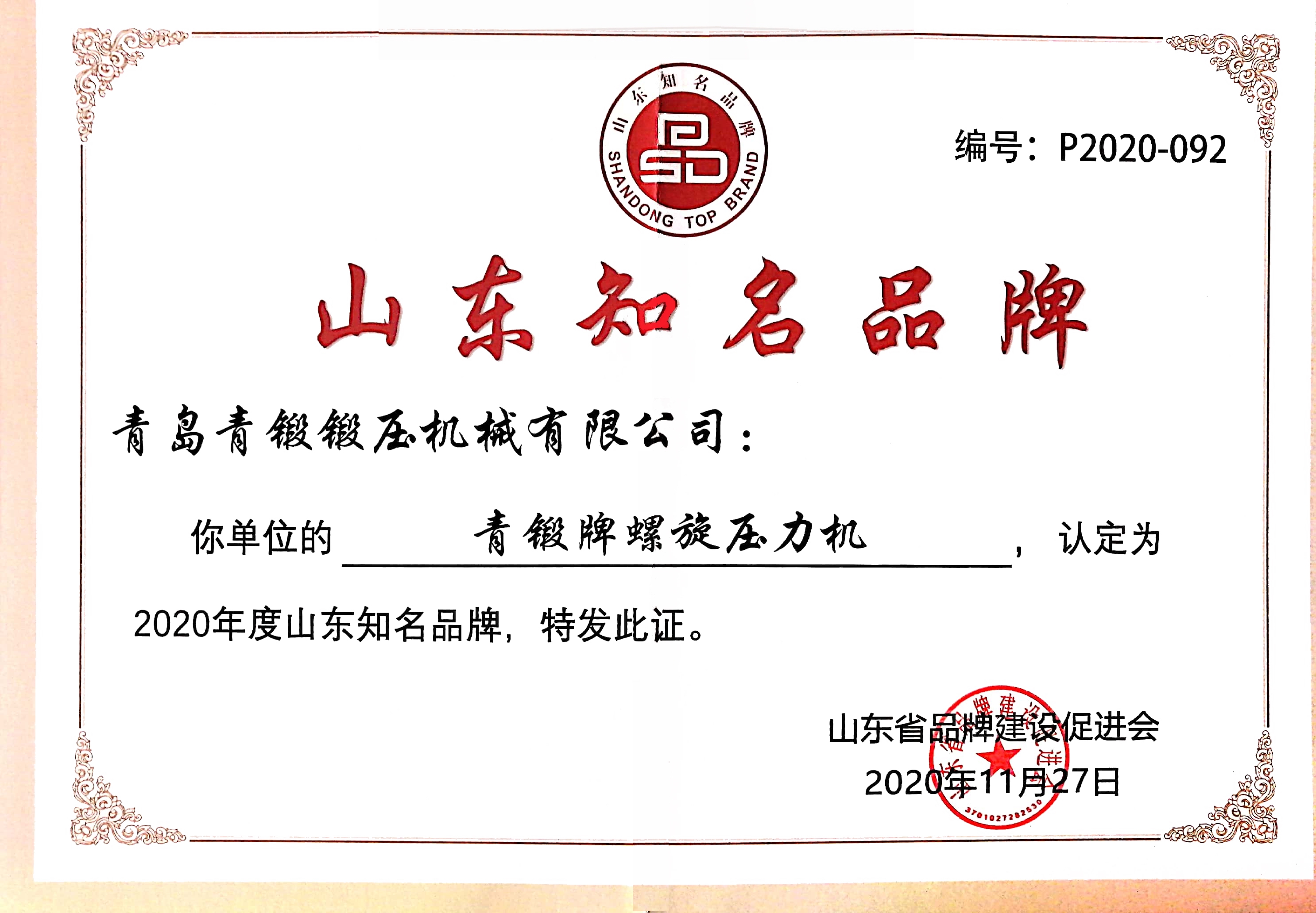 青鍛牌螺旋壓力機(jī)獲山東優(yōu)質(zhì)品牌、山東知名品牌